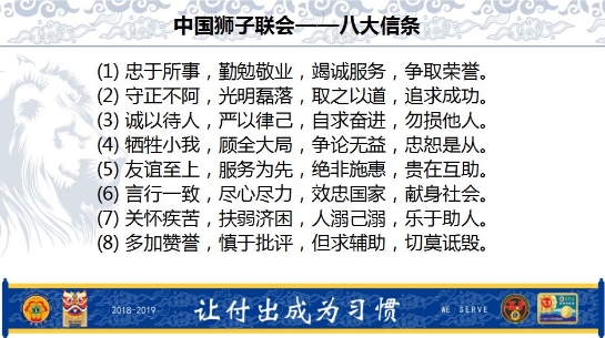 -我们继续深化服务,提升水准;做服务社会、快乐慈善的传播者;用实际行动召唤更多支持者,传播:学习、互勉、感恩、博爱的价值观。下面,我做一个大胆的尝试,邀请在场的所有嘉宾共同参与,一起了解与社会主义价值观紧密结合的狮子文化!好的,现在邀请全场所有领导、嘉宾朋友们,起立!我们一起朗读大屏幕上的文字!