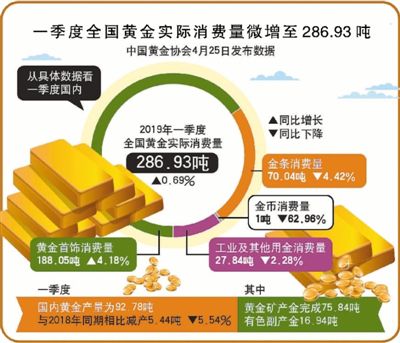 中国黄金协会数据显示,2018年,国内黄金产量401.119吨,连续12年位居全球第一,但与2017年同期相比下降5.87%;今年一季度,国内黄金产量为92.78吨,与2018年同期相比下降5.54%。