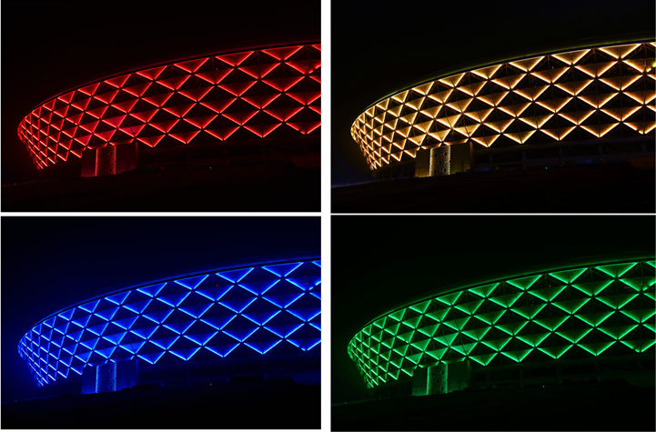 场馆外面立面照明则采用24W线条灯(RGB全彩),采用平日模式、一般节日模式、重点节日模式三种智能控制方式,起到节能控制与渲染效果的双重作用。