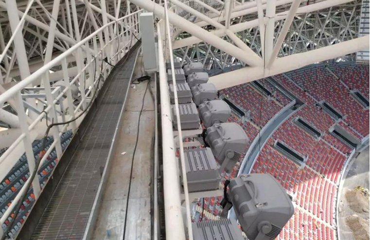 考虑到体育场采用圆形平屋面罩棚,而且罩棚高度够高,三雄极光选择马道式安装灯具,不仅布置和维护都比较简单,还能提供一定的垂直照度。灯具选择上采用了360套2000W金卤灯,光源深藏于灯具内部,有一定的出光保护角,防眩效果比较好。这样既增强球迷体验、改善电视转播,又不会影响场上运动员发挥。