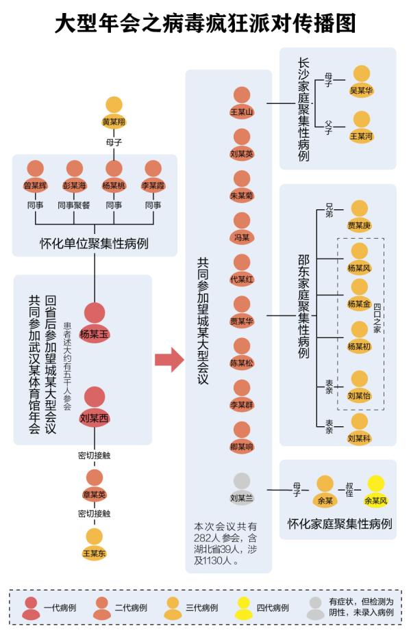 一张病毒疯狂的传播图谱,清晰地勾画出涉及湖北、湖南、贵州、广东等四省六市,经四代传播的所有确诊病例的传染脉络,最终构成一张让人惊悚的传播大网。