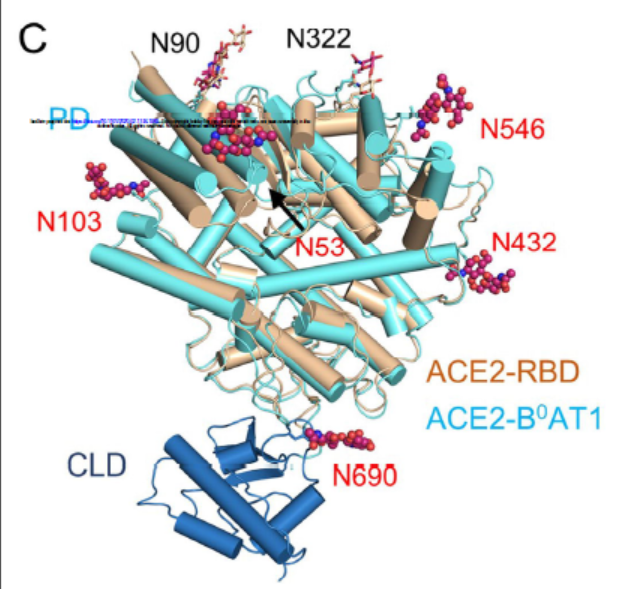 ACE2-B0AT1复合物的原子模型展示,糖基化部分显示为棒,复合物由亚基着色,ACE2前体中的蛋白酶结构域(PD)和Collectrin样结构域(CLD)分别为青色和蓝色