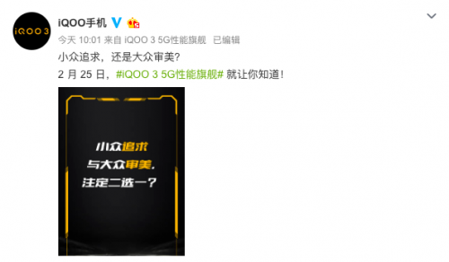 经过一段时间的预热,iQOO 3的主要配置相信大家已经有所了解。对于社交网络上的调侃言论“iQOO 3发布会就差价格了”来说,其实还有很多没有被曝光的黑科技等待我们去发现。今天,iQOO官博继续放出态度海报:“小众追求与大众审美注定二选一?”,结合放出的外观视频,之前备受好评的压感按键也得到保留,iQOO 3的真实面目已经浮出水面。