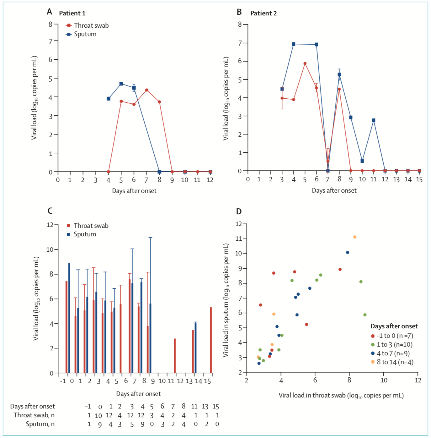 咽拭子和痰液样本中的病毒载量在发病后的第5-6天左右达到高峰,范围在104-107拷贝/毫升(图A, B)。这种病毒载量模式的变化明显不同于SARS患者,SARS患者一般在发病后10天左右病毒载量达到高峰。而痰液样本的病毒载量普遍高于咽拭子样本。