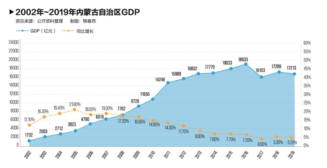 不过,随着全国经济增速放缓,煤炭价格下跌,内蒙古快速跌入低潮。内蒙古的经济增长迅速从全国前列,变成全国倒数。经济高开低走,大起大落得让人瞠目结舌。