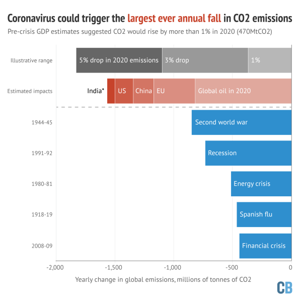 英国能源研究机构CarbonBrief一项最新分析显示,受疫情影响,2020年全球碳排放量可能下降4%。该研究机构副主编西蒙•埃文斯(Simon Evans)称,这将比以往任何一次经济危机或战争所造成的年度降幅都要大。