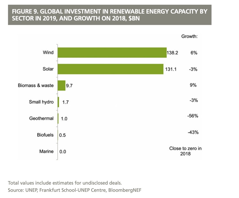 2019年全球可再生能源投资额,依次代表风电、太阳能、生物质能和废弃物、小水电、地热、生物燃料和海洋能