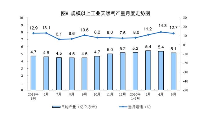 天然气生产保持较快增长。5月份,生产天然气159亿立方米,同比增长12.7%,增速比上月回落1.6个百分点,日均产量5.1亿立方米。1—5月份,生产天然气788亿立方米,同比增长10.1%。