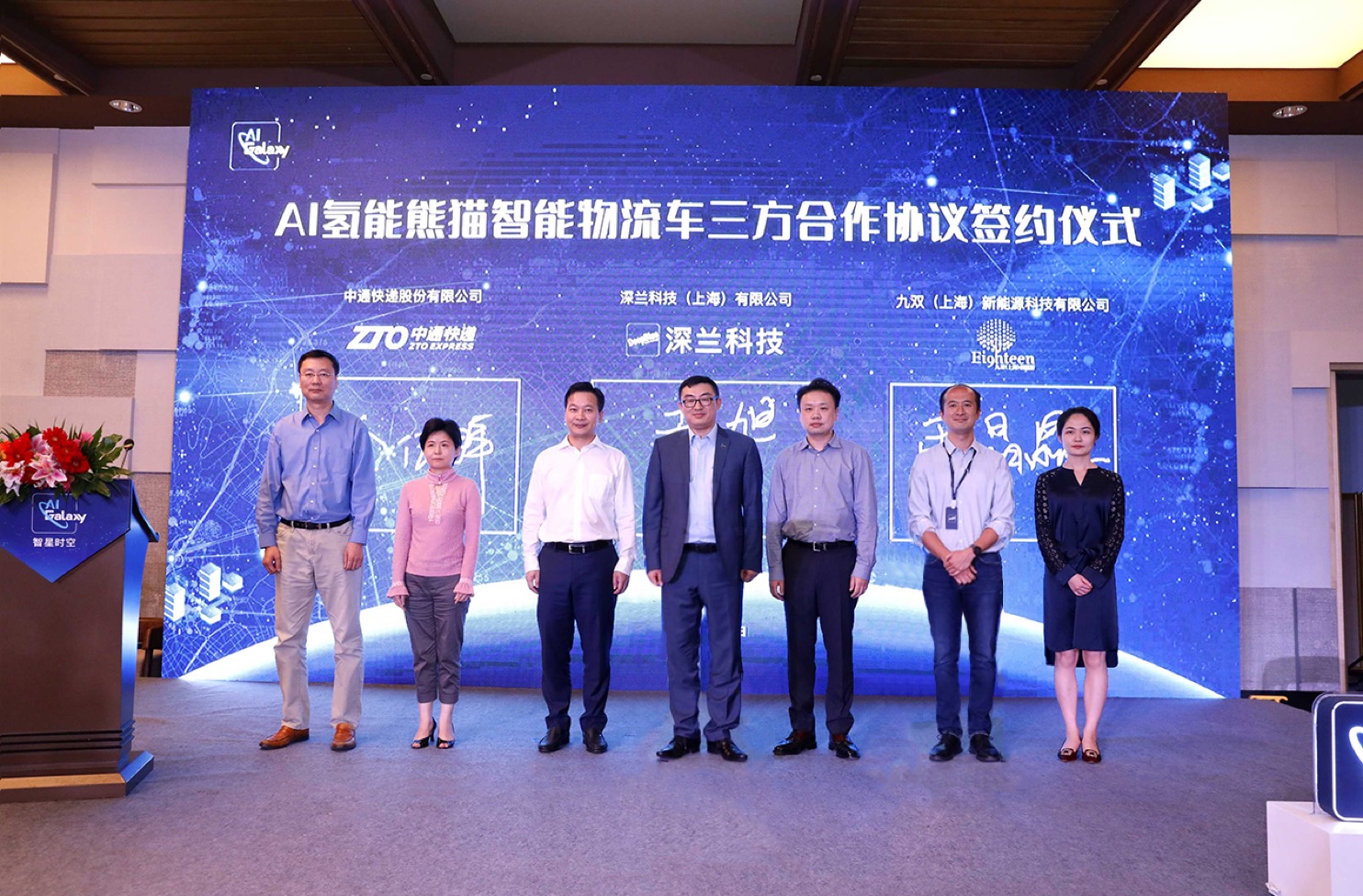据悉,“AI氢能熊猫智能物流车三方合作协议”由中通快递股份有限公司上海分公司、深兰科技(上海)有限公司(下称“深兰科技”)、九双(上海)新能源科技有限公司三方签署,三方希望通过氢能物流车、加氢站、智能化加氢站解决方案相结合,实现氢燃料电池车、加氢站、管理平台高效的统一。