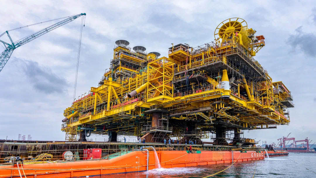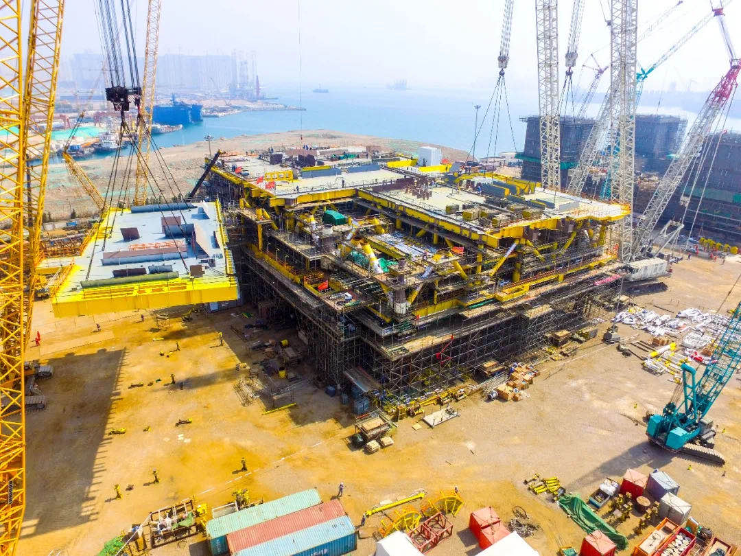 平台组块由23个甲板片组成,装配近200套关键油气处理设备,并包含一个可以容纳120人的生活楼。组块设计重量近2万吨,相当于近200辆超重型卡车的载重量总和,敷设电缆总长达43万米,可环绕北京六环两圈多。它的成功建造,进一步提升了我国深水海洋工程装备自主设计建造技术和能力水平。