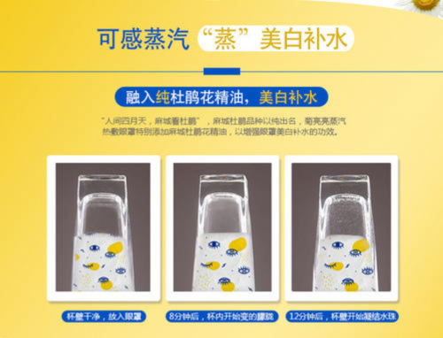 菊亮亮蒸汽热敷眼罩,该产品由无纺布眼罩、发热体、明钼菊提取物和杜鹃花提取物构成。打开包装开始发热,并伴随微细蒸汽释放,通过添加特有的明钼菊精油,能够湿润眼周皮肤,起到缓解疲劳、明目养眼、美白补水、淡化黑眼圈等作用。且由于加入了融入杜鹃花精油同,可实现美白补水之功效。据悉,湖北麻城杜鹃花是世界上大的映山红群落,其面积之大、年代之久、密度之高、品种之纯、花色之美,中国一绝,世界罕见。据研究表明,杜鹃花性甘微苦、平、清香,在医学上有一定的药用价值,祛,调经和血,安神去燥,长期饮用有美白和祛斑之功效。菊亮亮蒸汽热敷眼罩通过添加特有的杜鹃花精油,实现了增强眼罩美白补水的功效。