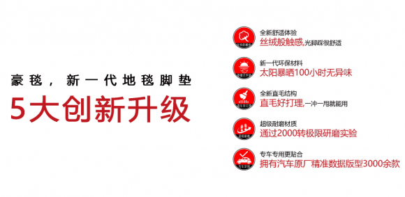 众所周知,地毯类汽车脚垫,有着原车毯的舒适体验和高端享受,但是最大的痛点是:不好打理。这成了车主朋友对地毯类脚垫望而却步的主要原因。豪毯汽车脚垫,经过4年的探索钻研,创造性地解决了地毯类脚垫的问题和缺点,5大创新突破让豪毯脚垫成了新一代地毯类脚垫的领军品牌。