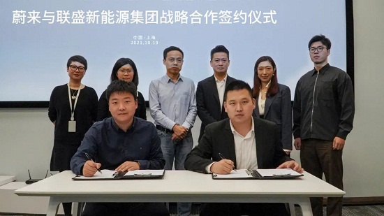 10月19日,联盛新能源与蔚来战略合作签约仪式在蔚来总部举办,蔚来能源高级副总裁沈斐、电网集成解决方案负责人刘隽、联盛新能源集团CEO郝鹏、市场总监李欣京、CEO助理郭抒昂出席了签约仪式。