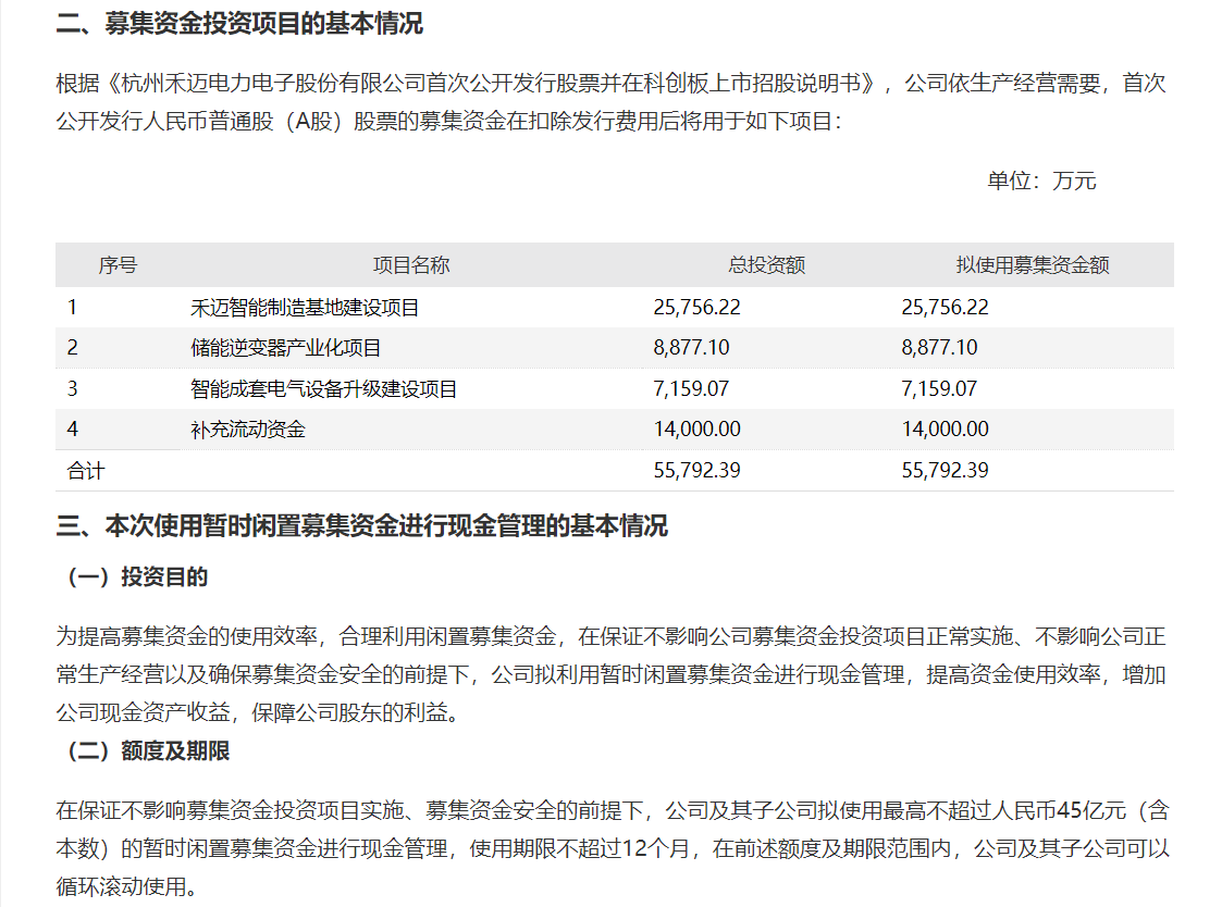 上市首日晚间,禾迈股份发布了关于使用部分暂时闲置募集资金进行现金管理的公告,同意公司及其子公司使用最高不超过人民币45亿元(含本数)的暂时闲置募集资金进行现金管理。