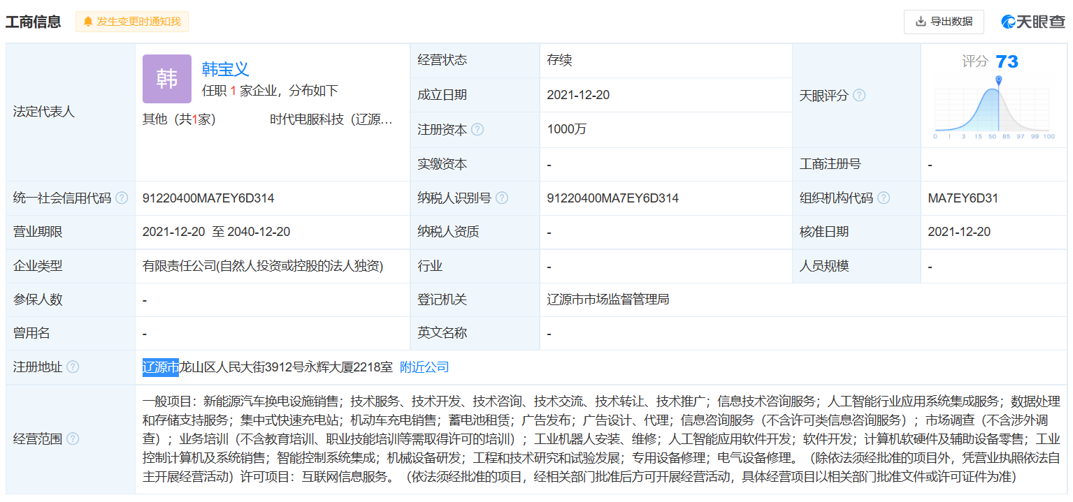据天眼查App显示,时代电服科技(辽源)有限公司于2021年12月20日成立,注册资本1000万,法定代表人为韩宝义,注册地址为吉林省辽源市龙山区人民大街3912号永辉大厦2218室。经营范围包括新能源汽车换电设施销售、人工智能行业应用系统集成服务、数据处理和存储支持服务、集中式快速充电站、机动车充电销售、蓄电池租赁等。 股权穿透信息显示,该公司由时代电服科技有限公司100%控股,而后者为宁德时代的全资子公司。也就是说,时代电服科技(辽源)有限公司是由宁德时代间接全资控股的孙公司。