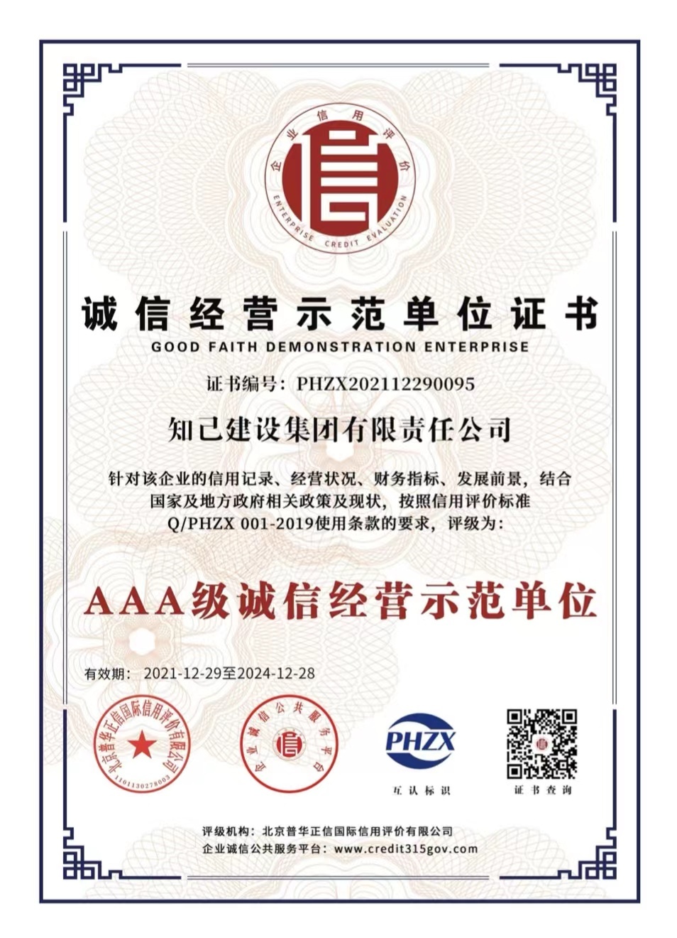 知己建设集团有限责任公司始终加强企业诚信建设,将诚信建设贯穿于生产经营管理的全过程,将诚信建设转化为全体员工的自觉行动,做到诚信经营、守法经营、规范经营。
