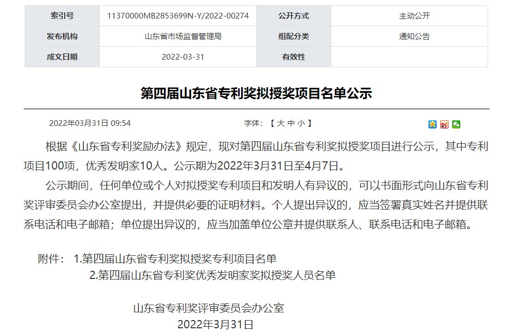据了解,中国专利奖是我国知识产权领域的最高奖项,也是中国唯一对授予专利权的发明创造给予奖励的政府部门奖。该奖项由中国国家知识产权局和世界知识产权组织共同主办,并获得了联合国世界知识产权组织(WIPO)的认可,是我国针对发明创造设立的至高荣誉政府奖项。山东省专利奖是为了加快知识产权强省建设,助力山东省新旧动能转换重大工程实施,全面提高知识产权的创造质量、运用效益,鼓励和表彰创新,根据《山东省专利奖励办法》举办的一项重要评选活动。