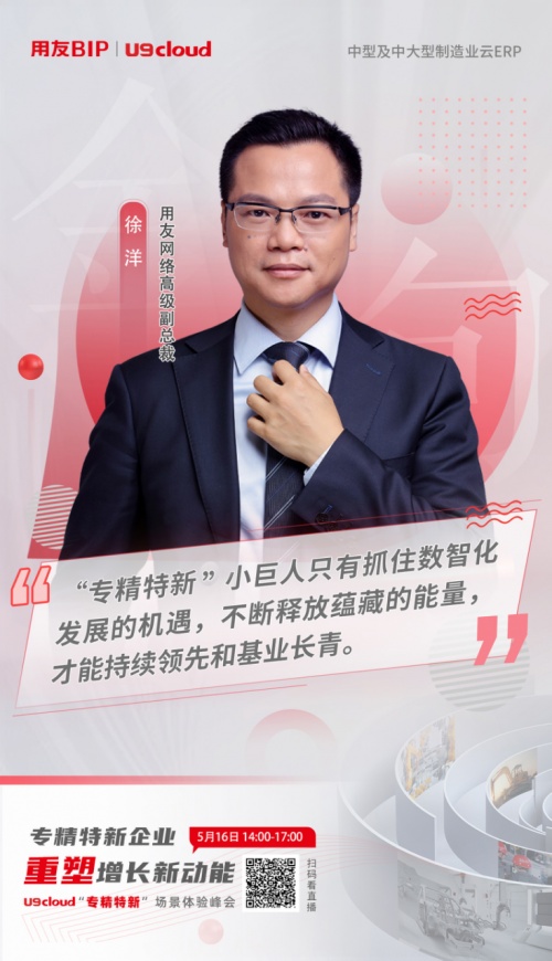 服务企业数智化转型和商业创新,用友一直是行业领导厂商。用友公司高级副总裁徐洋说:“近两年,我们已经帮助了很多专精特新企业打造新的数智化平台。助力专精特新企业规模扩张和快速成长。另外,针对专精特新企业,特别是在IPO的内控合规方面,可以帮助企业更加省事省心。U9 cloud可为企业提供内控管理的良好的支撑。”