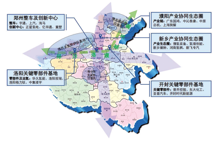 2.郑州、新乡、洛阳、开封、濮阳氢能装备制造产业节点。支持郑州、新乡、洛阳、开封、濮阳等地大力发展氢能全产业链装备制造和一体化布局,充分发挥各自优势,依托龙头企业、科研院所及高校,引进企业等开展战略合作,加快形成国内领先的氢能装备产业集群。郑州市依托河南投资集团、宇通客车、上汽集团(600104)、郑州大学等,打造国内领先的燃料电池商用车产业示范基地、氢能产业关键技术研发和科技创新示范区。濮阳、新乡市加强与中国石化、上海交大合作,依托骨干企业建设氢能产业园,构建氢能产业生态圈,打造豫北氢能协同发展高地。开封、洛阳市依托奇瑞汽车、亚普汽车、洛阳双瑞等企业,打造氢能产业关键零部件研发制造高地。