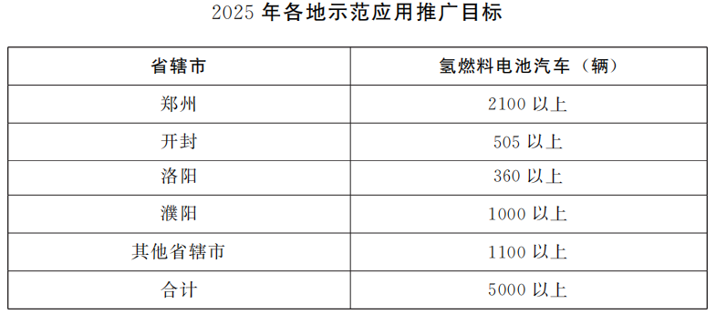 (三)发展目标。到2025年,氢能产业关键技术和设备制造领域取得突破,产业链基本完备,产业链相关企业达到100家以上,氢能产业年产值突破1000亿元。发挥基础设施引领作用,适度超前布局建设一批加氢站。氢能应用领域不断拓展,交通领域氢能替代初具规模,推广各类氢燃料电池汽车5000辆以上,车用氢气供应能力达到3万吨/年,氢气终端售价降至30元/公斤以下,绿色低碳比例不断提高,建成3—5个绿氢示范项目。郑汴洛濮氢走廊基本建成,郑州燃料电池汽车城市群示范应用取得明显成效,初步建成氢能国家级先进制造业集群。