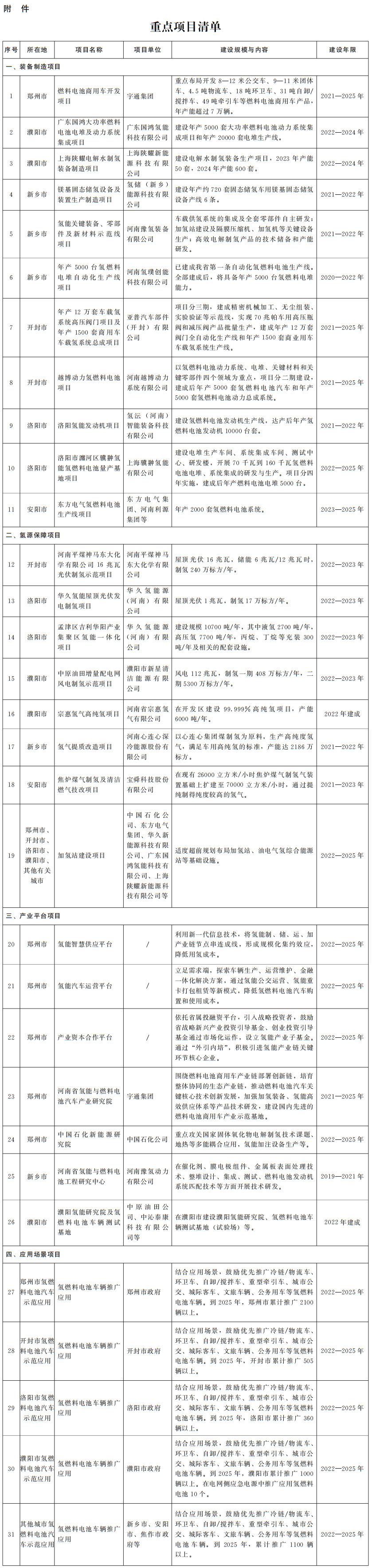 5.新乡市。新乡市依托河南省氢能与燃料电池工程研究中心、河南中氢动力电池研究院等研发平台和新乡高新区氢能产业园等产业载体,发挥河南战新新乡氢能专项基金的引领撬动作用,以及豫氢装备、氢璞创能、新乡骥翀、河南氢枫等骨干企业集聚效应,重点打造“制氢—储氢—加氢—氢燃料电池及系统”协同发展体系,以氢燃料电池渣土车、冷藏车、环卫车示范运营为契机,利用新飞专汽品牌优势,打造新能源专用车生产基地,谋划建设氢能装备制造及检测检验中心,构建氢能产业协同示范运营体系。(责任单位:新乡市政府)