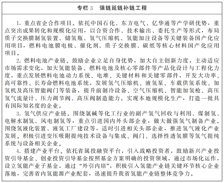 (二)引育并举打造产业链竞争优势。以未来技术产业化为重点,加强跨周期战略谋划,整合优化省内外资源配置,引进省外企业和资本,加快细分领域建链延链补链强链,布局建设一批产业支撑项目,打造若干氢能产业园区,推动氢能产业在空间布局上趋于集中、功能上趋向集聚、定位上互补发展,着力打造中部地区重要的氢能装备制造产业集群。