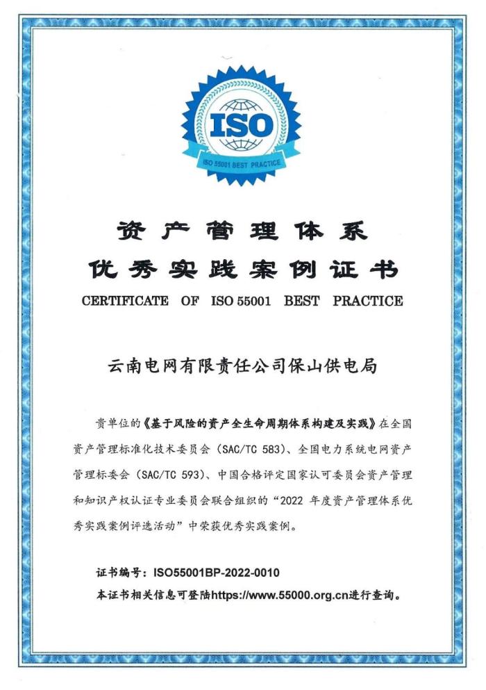 近期,南方电网云南保山供电局的资产管理项目,在Intertek天祥集团资产管理体系项目组的支持和帮助下,在“2022年度资产管理体系优秀实践案例评选活动”中荣获优秀实践案例,该评选由全国资产管理标准化技术委员会、全国电力系统电网资产管理委员会、中国合格评定国家认可委员会资产管理和知识产权认证专业委员会联合组织。