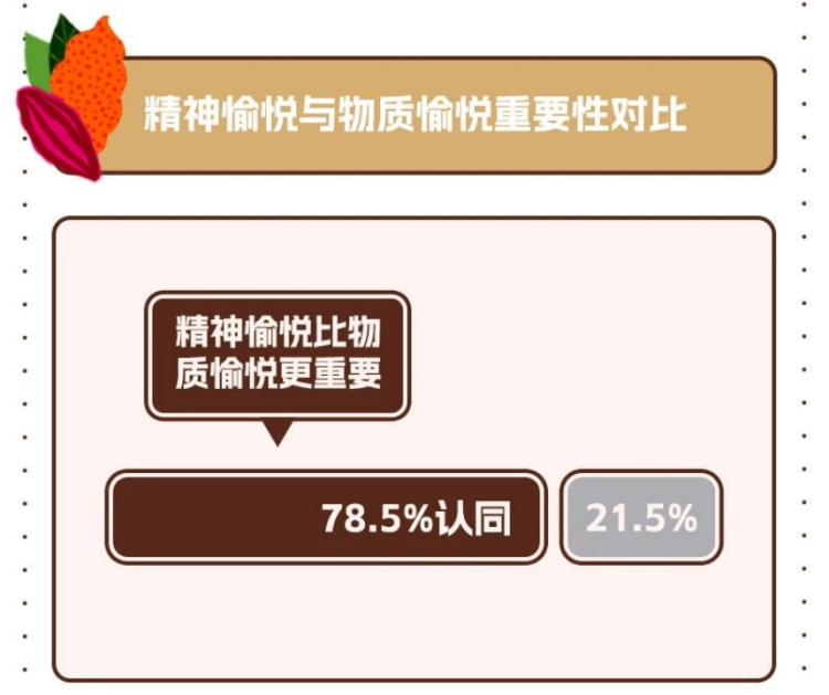 《2023“内啡肽”⻘年洞察》对于愉悦的多项洞察可见德芙升华品牌内涵及愿景的初心。根据这份调查显示,当代人的愉悦来源不再停留在基本的物质层面,他们也希望有升级的愉悦,也就是由成就感带来的精神层面的愉悦。