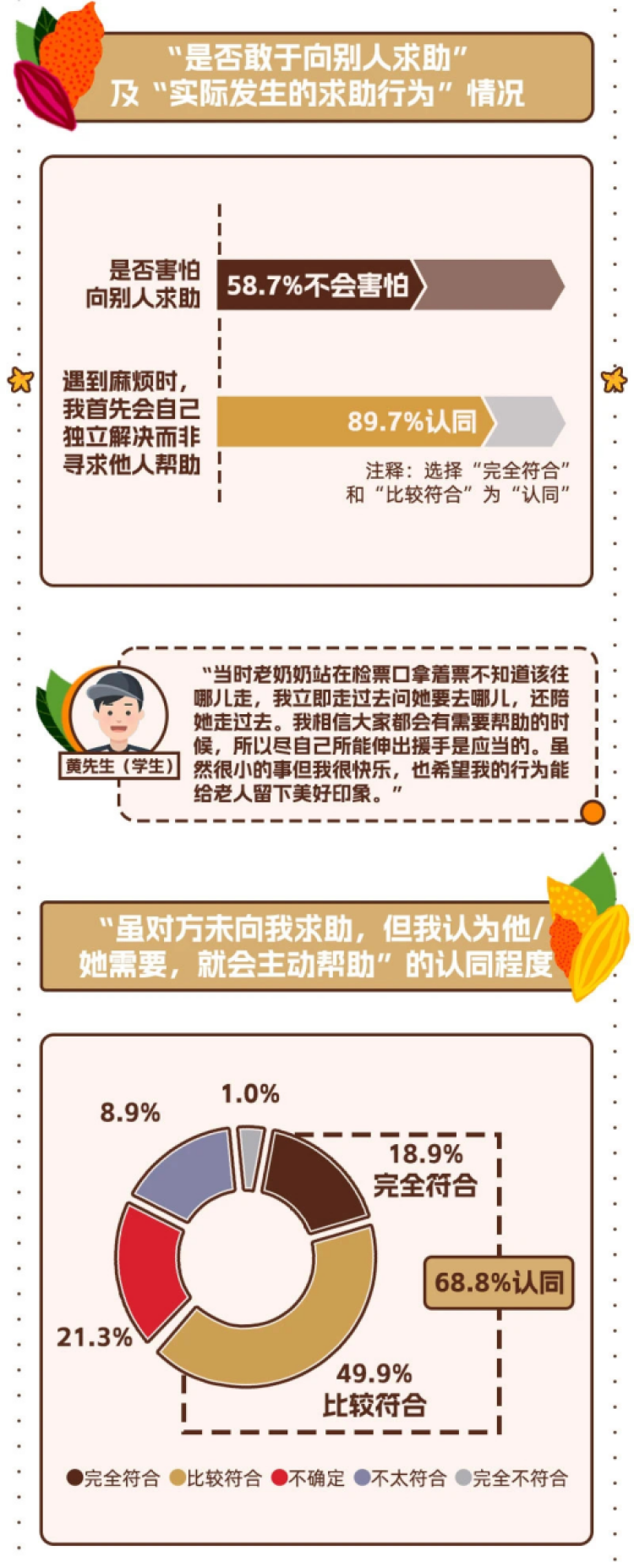 但与此同时,近九成受访者在遇到困难时更倾向自己独立解决而非向他人求助。腾讯新闻谷雨工作室编辑总监赵涵漠指出,“跟这个数据能够作为一个对照来看有一个非常有趣的数据,当人们发现周围有人需要帮助情况时,即便对方还没有开始求助,将近70%的人都会主动去提供帮助。”