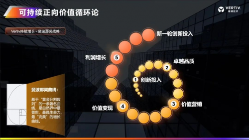 通过长期发展战略,维谛形成了正向的可持续发展价值循环,正如斐波那契曲线一样最普世、最具生命力、最“完美”地增长:基于创新投入,实现产品的卓越品质,保证产品的稳定可靠;在团队的强有力支撑下,通过价值营销,带来价值变现;在实现利润增长的同时返哺创新投入。在整个体系里面,核心的要素是高质量,因为要高质量、高性能的产品解决方案,才能使得我们螺旋上升的循环能够不断地、持续地转起来。