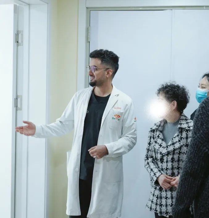 在超皮秒案例操作现场,阿杜博士手持国家药监局认证的仪器,为一位色斑患者制定个性化方案。
