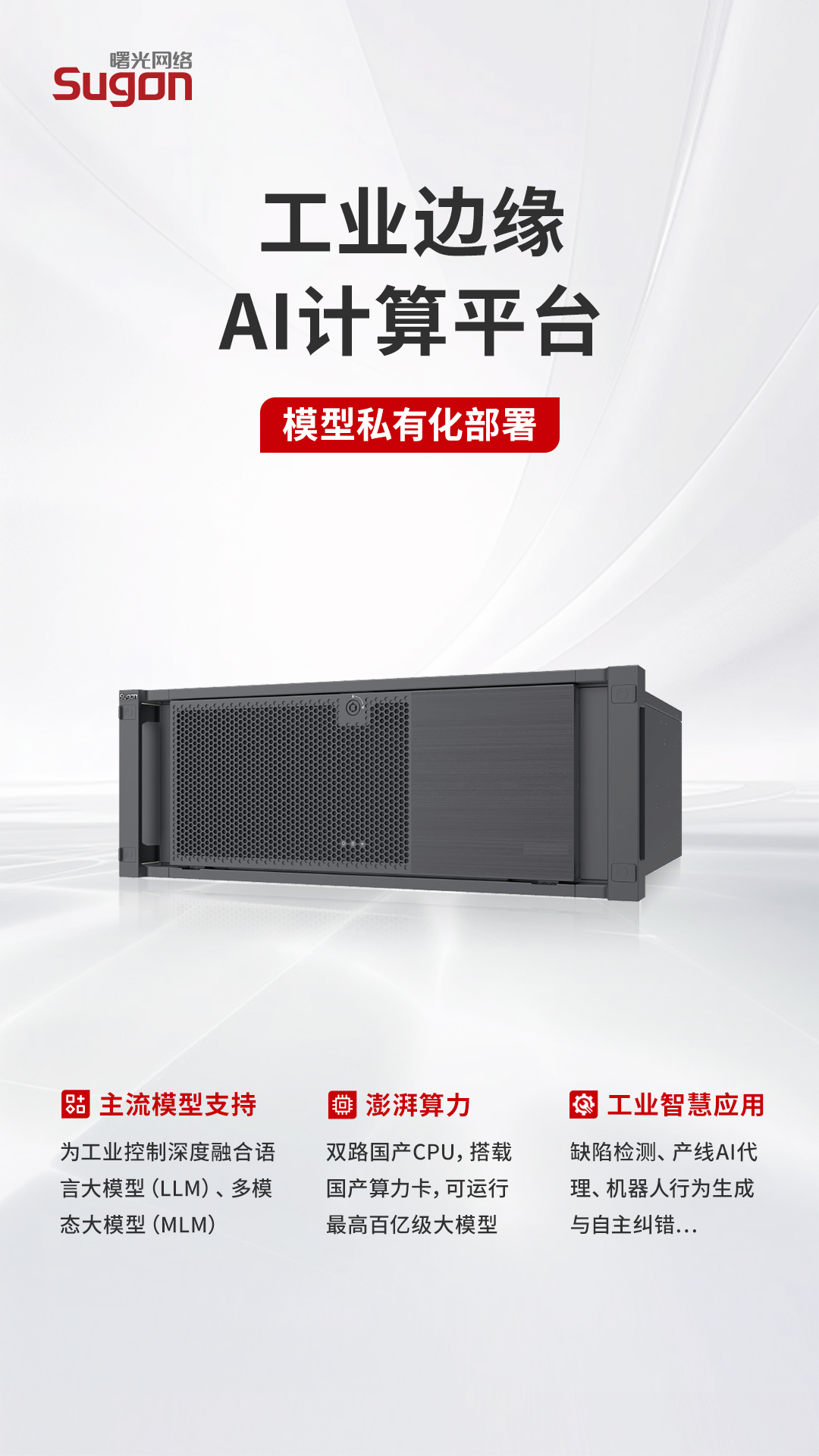 此外,该一体机搭载双路CPU与国产AI加速芯片,支持百亿参数模型,结合自主可控的SugonRI OS操作系统,为AI算法运行与工控任务执行提供稳定算力支撑。同时,通过全链路国密算法与零信任安全架构,实现从芯片级到系统级的内生安全,确保AI分析与控制指令在传输与执行过程中的安全可信。