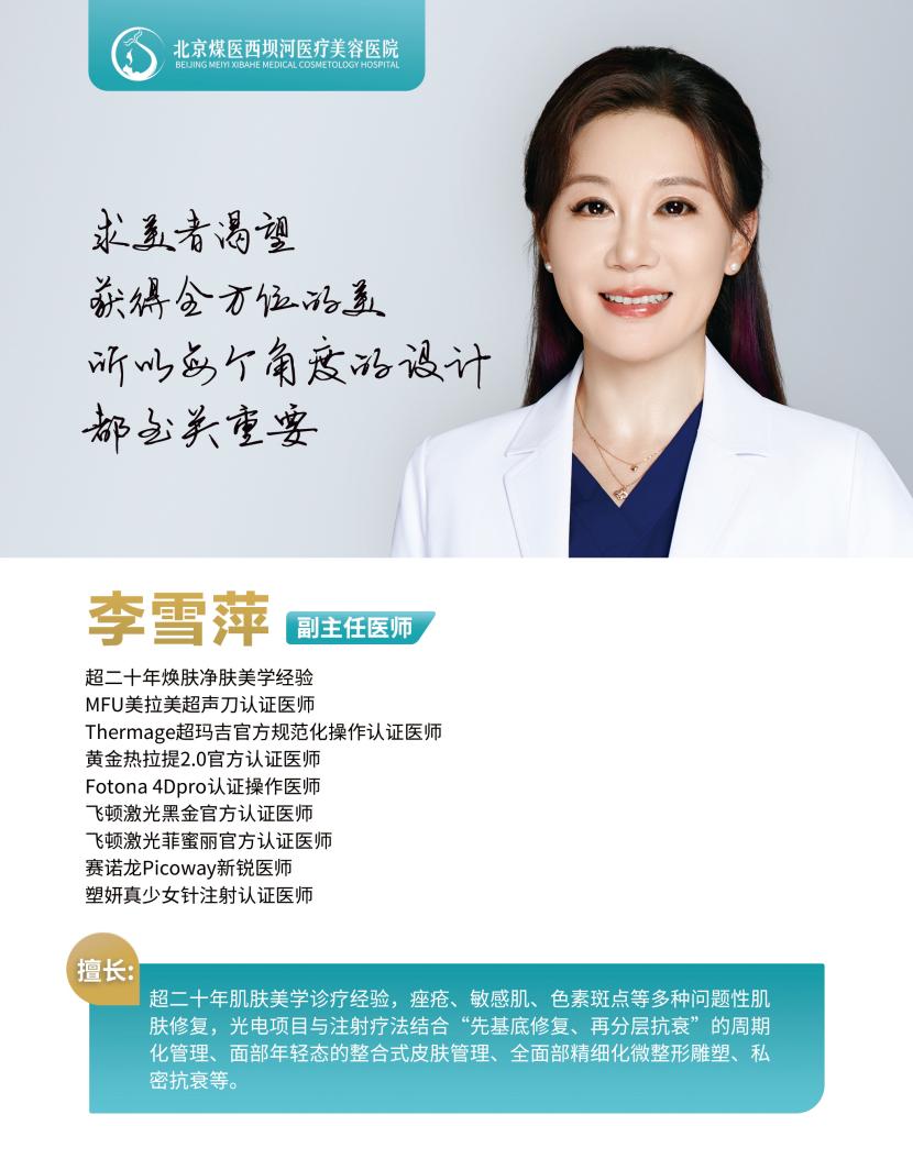 北京煤医医疗美容医院皮肤科副主任医师李雪萍医生,凭借20余年临床研究与技术创新,推出“斑敏痘整全式治疗方案”,通过“精准分型-整合干预-全周期管理”三维模式,实现色斑、痤疮、敏感肌有效治疗提升,复发率极低。3步曲“处方式”美肤体验是问题肌治疗从“单一手段”向“系统化解决方案”的跨越。
