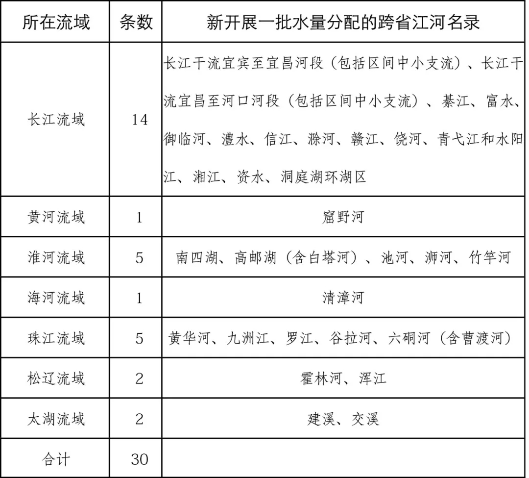此外,微信公众号“中国水利”发布了此次新开展一批水量分配的跨省江河名录,共涉及长江流域14条江河、黄河流域1条江河、淮河流域5条江河、海河流域1条江河、珠江流域5条江河、松辽流域2条江河、太湖流域2条江河。