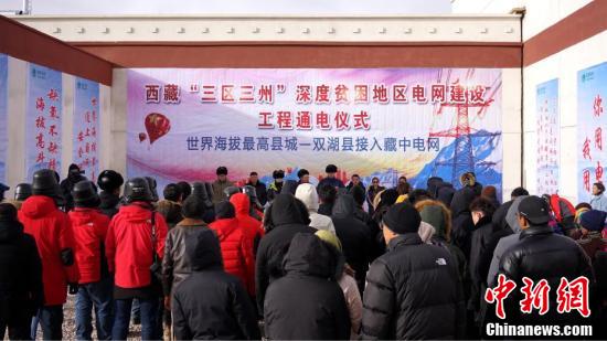 中新网12月24日消息,当日,西藏自治区那曲市双湖县举行110千伏变电站投运仪式,中午时分,电力施工人员合上最后一个开关,这标志着中国海拔最高的县正式接入藏中电网,结束限电史。图为电力施工人员在双湖变电站合上电力开关。