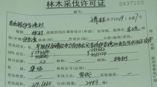 记者了解到,靖边县东坑镇伊当湾村委于2019年6月5日提出采伐申请,并提供了由第三方中介机构编制的《华能陕西靖边电力有限公司东坑伊当湾100兆瓦光伏电站项目林木采伐作业设计》。靖边县林业局经现场勘验并于6月18日办理了《林木采伐许可证》,先后共采伐杨树2483株。靖边县林政稽查大队6月17日曾现场勘验,未发现该项目地林木有事前(先前)被采伐的痕迹。采伐手续符合规定程序,村民反映“砍伐10万株杨树”与事实不符。