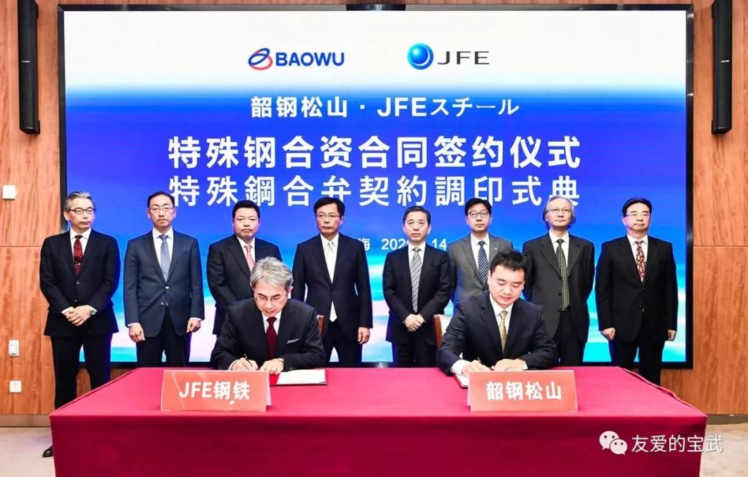 1月14日上午,宝武杰富意特殊钢有限公司合资合同(下称“宝武杰富意特殊钢”)签约仪式在宝武大厦举行,中国宝武董事长陈德荣与日本JFE钢铁株式会社社长北野嘉久共同见证签约。