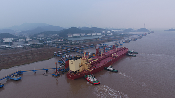 澎湃新闻从中国石化集团获悉,1月19日,宁波舟山港北仑港区算山码头,从沙特阿拉伯运载约26.2万吨原油的30万吨级“热情”号油轮缓缓靠泊并开始卸油,标志着算山码头累计吞吐量突破6亿吨大关,刷新国内企业自备海运码头累计吞吐量最高纪录。