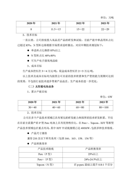 太阳能电池业务累计产能目标为:2020年30-40GW, 2021 年40—60GW ,2022 年60—80 GW,2023 年80—100GW。