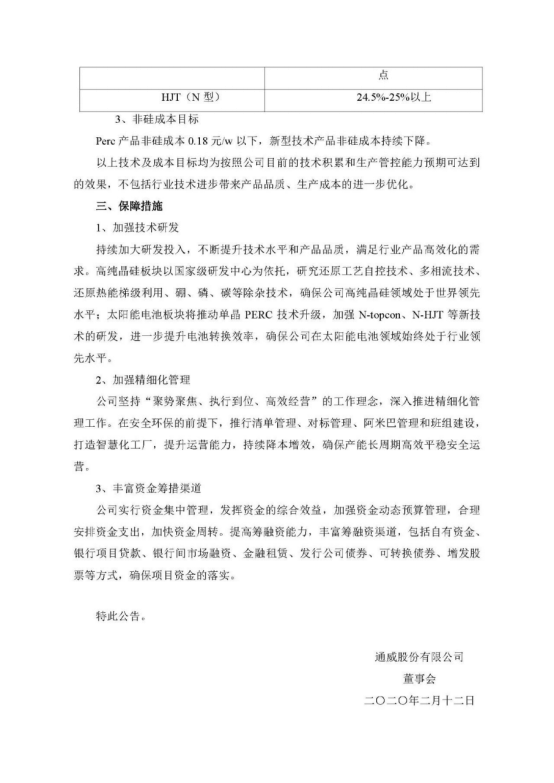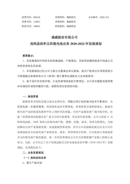 2月12日,通威股份发布多份公告。其中包括“通威股份高纯晶硅和太阳能电池业务2020-2023年发展规划”、“通威股份关于投资建设年产30GW高效太阳能电池及配套项目的公告”等重要公告,明确未来四年将建设达100GW太阳能电池和29万吨高纯晶硅。