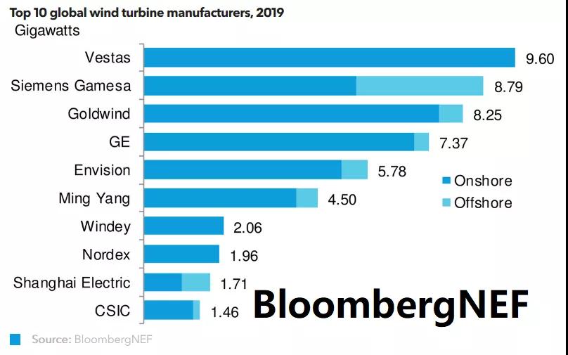 中国海上风电市场的快速崛起使得上海电气,远景能源,金风科技,明阳智慧能源分别位列第三到第六。