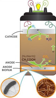 在这种特殊的电池内部的无氧溶液环境中,这些细菌释放出二氧化碳,质子和电子。自由电子于是便构成了负电极,而质子则构成正电极。这样电流便产生了。