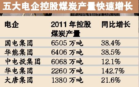 为了缓解火电经营成本压力,五大电企纷纷将今年的煤炭资源开发列为发展重点,提出大幅提高煤炭产量,大步进军煤炭开采,将目标瞄准“亿吨”级。国家发改委等主管部门多次提出要推动煤电一体化经营。截至2011年底,五大发电集团控制的煤炭产能总量已经接近2.5亿吨,而根据各集团制定的“十二五”发展目标来看,到2015年,五大发电集团控制的煤炭产能很可能将超过4亿吨。