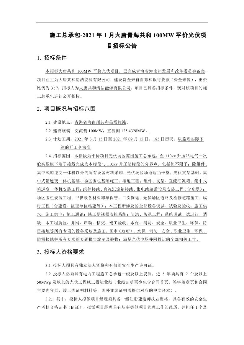 近日,大唐集团电子商务平台发布2021年1月大唐青海共和100MW平价光伏项目招标公告。