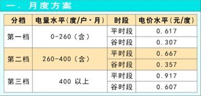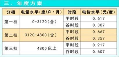 具体实施时,无论最终选用三套方案中的哪一套,电量在第一档范围内,夜间的谷时段电价保持当前的0.307元/度;用电量在第二档时,谷时段单位电价加价0.05元,即0.357元/度;第三档时,谷时段单位电价加价0.3元,即0.607元/度。