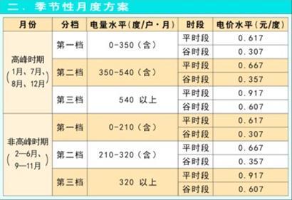 方案二:考虑了居民不同季节的电量差异,电费结算月结月清。但由于本市居民电表抄表时间跨度较长 (通常为每月的1日至15日),难与季节性时段精确匹配,管理难度较大,由于气候原因,天热和天冷的时间分布不均,用电高峰月份很难科学、合理确定。