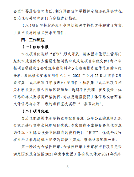 根据国家能源局《关于2021年风电、光伏发电开发建设有关事项的通知》(国能发新能〔2021〕25号)的要求,自治区能源局通过竞争性配置统一组织优选确定保障性并网项目。由各盟市能源主管部门组织申报企业完成项目申报工作,对项目进行初选后提交申报材料,按照竞争性配置方式择优选择项目列入年度建设计划。