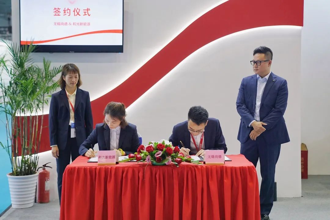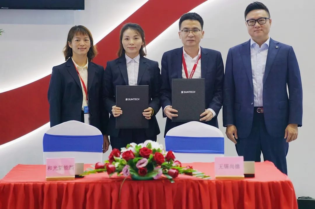 当日下午,无锡尚德与无锡市和光新能源科技有限公司签订战略合作协议,无锡尚德供应链总监吴庆丰,无锡尚德海外区销售总监郑毅与和光新能源科技有限公司副总经理左安香,副总经理韦黎珍出席签约现场,分别代表双方进行签约。