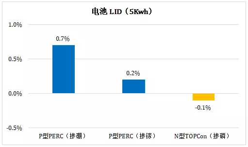1973年H.Fischer等在P型掺硼CZ晶硅电池上发现了LID,1997年Jan Schmid等证实这是因为形成了硼氧复合中心,该机理得到了业界一致认可。为了在P型晶硅上改善这一问题,工业届采取了如下几种方式:(1)降低氧含量,通过热场及拉晶工艺降低硅片氧含量;(2)采用镓替代硼作为P型掺杂剂;(3)LID恢复处理:2006年Alex Herguth等人发现在较高温度的光照条件下或在施加正向电流的情况下,硼氧对会经历衰减—再生过程,这一过程能有效改善LID现象。而掺磷的N型晶硅因为硼含量极低,本质上消除了硼氧对的影响,几乎不会产生LID现象。晶科能源根据IEC 63202-1标准规定的LID测试内容(1 sun,60±5 ℃,一般累计5 kWh,最大20kWh),对典型的晶硅电池LID(5kWh)衰减进行了测试,结果如下图所示:
