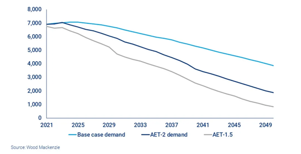 但是,在伍德麦肯兹AET-2情景预测下(即将全球气温上升控制在2°C内),到2030年动力煤需求需下降10亿吨;实现将全球气温上升控制在1.5°C内,需要减少19亿吨的需求。